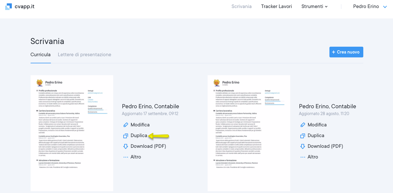 Esegui l’accesso a cvapp.it e visita la tua Scrivania. Qui, potrai visualizzare l’elenco dei tuoi curricula. Clicca sul pulsante “Duplica”. Vedi lo screenshot riportato qui sotto.