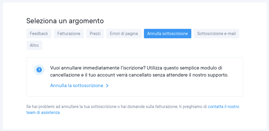 Puoi cancellare la tua sottoscrizione a CVapp.it direttamente dal nostro sito, senza nemmeno dover eseguire l'accesso. Per farlo, visita la nostra pagina Contattacie seleziona l’opzione “Annulla sottoscrizione” dal menu.