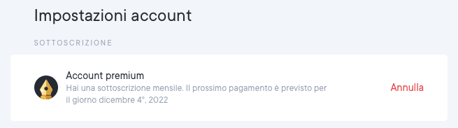 Dopo aver confermato la cancellazione, potrai continuare ad usufruire dell’accesso premium per 30 giorni dall’ultimo pagamento mensile o per 7 giorni dal pagamento della prova. Allo scadere della sottoscrizione premium, il tuo account torna automaticamente al piano base gratuito.