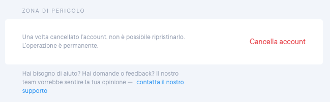 Se desideri cancellare definitivamente il tuo account, vai in fondo alla pagina delle Impostazioni account e clicca su Cancella account. Vedi lo screenshot riportato qui sotto.