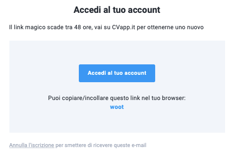 Se il tuo indirizzo funziona, ma non ricevi l’e-mail con il Magic Link, controlla la tua cartella spam o prova a cercare “cvapp.it” nella tua casella di posta in arrivo.